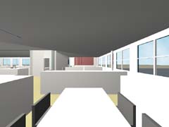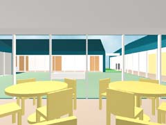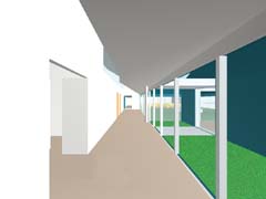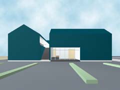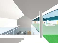 | 計画地 :神奈川県愛甲郡 | 広い工場敷地内において事務棟に充てられたほぼ正方形の一角。スレート葺切妻屋根の工場建物が敷地内外に林立する工業団地における計画である。坪30万前半のローコストということもあり、工場に既存のボキャブラリーを再度組み立てなおすことで新たな空間構成を図っている。ほぼ住宅スケールにまで尺度を落とした切妻の同一断面のボリュームを空隙を介しながら敷地内に巴型に配置し、群としての全体像を生み出している。1階には事務室群がほぼオープンにつながっており、2階に配置された関係諸室は、外(周辺住民)に対してでなく内(社員)のための緑である屋上庭園を回廊状に囲んでいる。 |