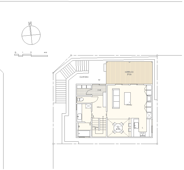 | 計画地 :横浜市青葉区 | 北向きひな壇の造成地。擁壁により道路より4m近く敷地地盤が高く、したがって道路面の北と西に向かって眺望が良く、南側は逆に隣地地盤が2mほどさらに高くなっている。北向きの眺望の確保、南からの日照の確保、パブリック、プライベート2種の異なる外部デッキスペース、約1800万円のローコストを要件に設計を行っている。極力シンプルな総2階建てのボリュームにデッキスペースを付加すること及びもう1種のデッキスペースを切り取ること、内部吹抜による日照の獲得と家族の気配を感じられるようにすること。標準的な敷地規模及び家族構成のためにローコスト住宅のひとつのプロトタイプとして考えることもできる。 |