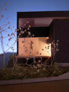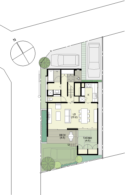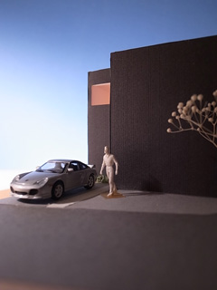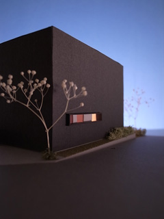 | 計画地 :横浜市鶴見区 | 敷地は横浜の丘陵地に典型的な起伏が多く入り組んだ道路の角地にある。 2敷地に分筆されて売り出された分譲地の南北に長い敷地で敷地自体はほぼ平坦である。 4人家族のための3つの寝室と子供の遊び部屋でもあり来客が宿泊できる和室、2台分の自家用駐車スペースと来客用の駐車スペースを確保することを所望された。共働きしつつ小さな2人のお子様の面倒を見るために家事動線は極力短くして、物干しの出来る広いバルコニー、クローズなキッチン、持ち帰った仕事が出来る書斎、大量の衣服を収納できるクローゼットを設けている。 2面道路である上に3台分の駐車スペースを設けるために敷地周囲に塀や植栽を設けることが難しいため、建物は道路からの視線を気にしないですむように閉鎖的な箱のような外観となっている。 2階テラスの他、1階にも広いウッドデッキを設けてバーベキューができるスペースも設けている。 |