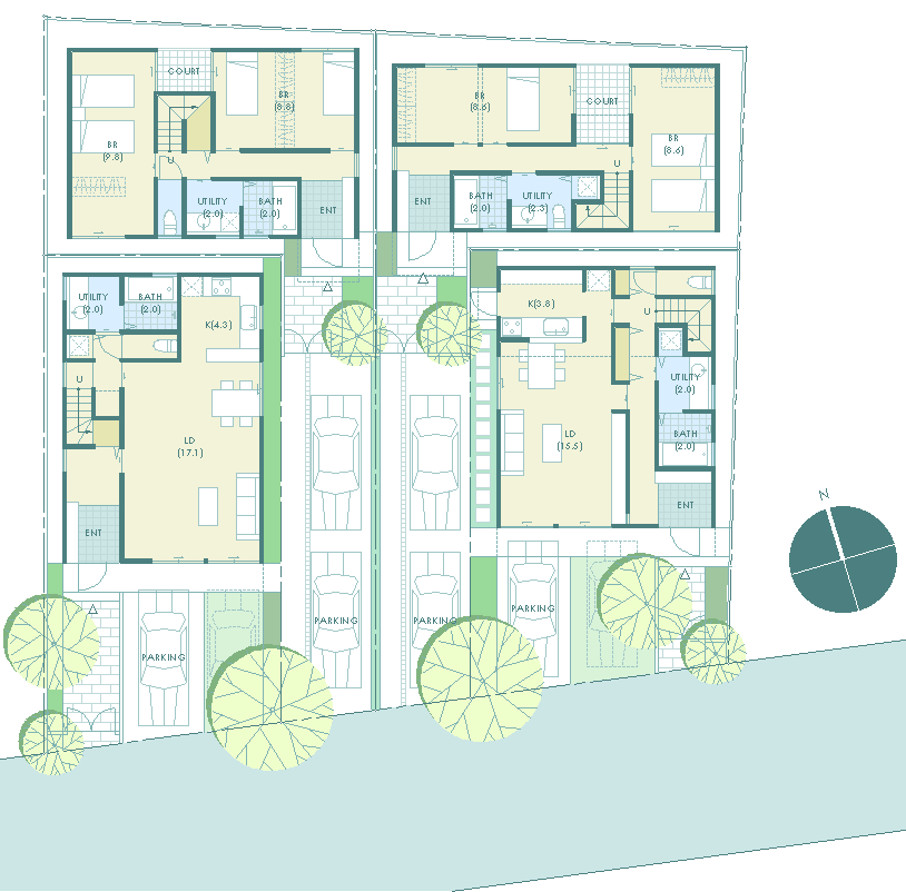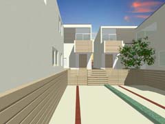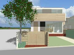 | 計画地 :東京都杉並区 | 井の頭線の線路に道路越しに面する敷地。4宅地からなる建売住宅の計画である。道路に直接面する敷地と専用通路にて接道する敷地とに常套的手段にて敷地分割されるが、専用通路を将来にわたって保証されたオープンスペースとして積極的に評価し、南側宅地の前庭とともにまとまった規模の緑地空間としている。電車の車窓からの無数の視線をも受け止めるに足る良好な景観を形成することを目指している。 |