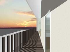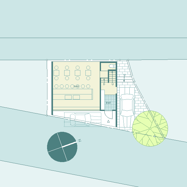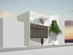 西側を鎌倉街道(22m)、東側を旧道らしき6m道路にはさまれたとても面白い敷地である。長屋スタイルの飲食店舗や、大きカーディーラーなどが鎌倉街道に面して軒を連ねている。夫婦2人+αの住居と鎌倉街道沿いに向いた店舗スペースを設けて、ゆくゆくは建主自らバーやカフェを営みたいということであった。非常に限られた予算内で、建主直営(建主は内装業)にてやれるものは全て自分で工事を行うということであり、1階の店舗は貸店舗にもできることが望まれた。 ローコストを考慮した計画として、いびつに変形した敷地の中から斜線の影響を受けない単純な3.5層のボリュームをとり出し、余った部分を表裏の道路を貫通する路地(パティオ)兼駐車場のスペースとしている。1階を店舗、2階を寝室、天井が高く開放感のある3階を居間とし、騒音が心配される西面には店舗の開口部のみしか設けていない。比較的静かで人通りの少ない東側道路に向けて住居の開口を大きく設け、寝室及び浴室のプライバシー確保のため木製ルーバーでゆるく視線を防御している。モダン風とビルっぽくない南国風という夫婦間で相違するテイストが示されたが、2面道路が功を奏して建物自体に表裏2つの異なる表情をもたせることができた。 |