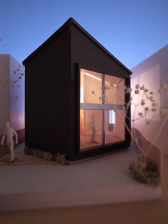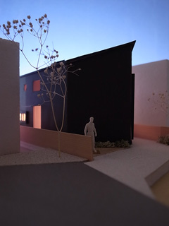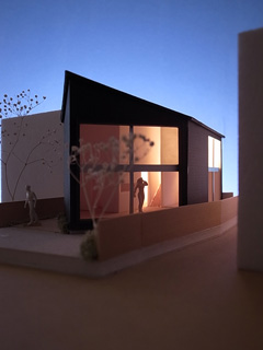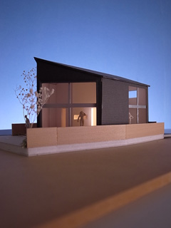 | 計画地 :横浜市保土ヶ谷区 | 商業地に近い横浜の下町。道路整備が整うよりも先に小住宅が建てられることで形成されてしまったような街区であり、世代交代とともに借地を買い取って住宅の建替えが進んでいて、三階建のプレハブ住宅や店舗、空き地の駐車場、トタン張りの古い住宅などにバラバラに囲まれた敷地である。 敷地は奥まった私道とかろうじて接道しているようないびつな形状の敷地であり、周辺の建物や住民との距離が近すぎているために、騒音や採光などの問題が生じやすくなっているようである。 この場所に長く住まわれてきた、リタイアされた御夫婦とその母親のための住宅の建替え計画であるが、少人数かつ高齢の家族であることと、建設予算を抑えるために建物は極力小さくして介護に備えたバリアフリーの住宅としている。周辺の建物が迫った奥まった敷地であるため建物の表情が作りにくいが、斜めの壁を持った5角形の建物として、この街区への調和しつつ屹立する存在感のある建物とすると同時にプライバシーの確保にも配慮している。 小さな建物であるが大きな吹き抜けを備えることで限られた時間帯の日照の確保と、低ランニングコストの全館空調を備えることを前提としている。 |