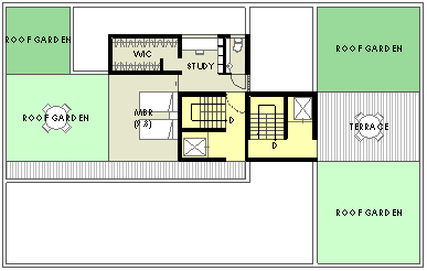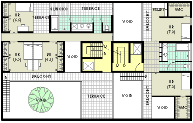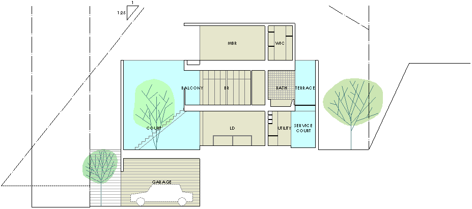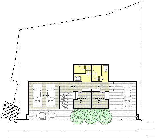 | 計画地 :神奈川県横浜市港北区 | 前面道路より3m程高い日当たりの良い敷地における完全分離2世帯住宅の計画。交通量の多い南東側の通りより見上げられる位置にあるので日照を取り入れながらその視線を遮ることと、防犯を考慮して、現況地盤レベルにコンクリートの閉鎖的な箱を置いて、その箱の中にプライベートな外部空間をあちこちにうまく内包することで採光と通風を取り入れている。下部の道路レベルに駐車場と玄関を設け、それぞれの世帯に設けるエレベーターを中心として2世帯を完全に分離できて、また将来的につなぐこともできる平面計画としている。 |