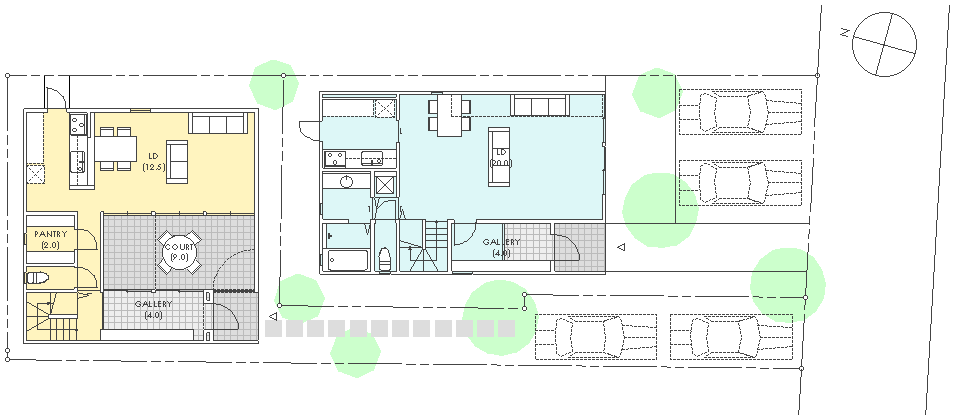 いわゆるデザイナー建売住宅2戸の計画。旧来のやり方で分筆された土地にあくまでローコストで30坪強の建物を一般的な4人家族を想定してという要件である。立地はよいので土地の分譲価格は建物の数倍もの価格となり、その高額に見合うなんらかのデザイン的な付加価値が要求された。