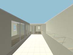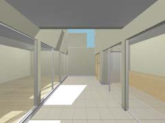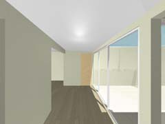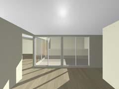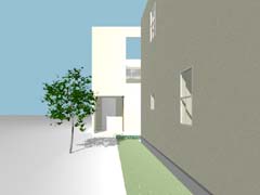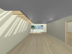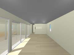 北側奥の宅地のために発生する長い通路は南側の恵まれた宅地の庭と一体化して開放的な庭として整備し、その分家の中にそれぞれ囲い込まれたコートを配置することで日照やプライバシーを確保している。デザイン的にはあくまで シンプルな構成ながら、2戸共通のデザインとできることで敷地を飛び越えて連続していくようなシーンが生み出されている。 家の中でも家族構成や暮らし方が限定されないように部屋と部屋、内と外があいまいにつながっていくような間取りとしている。 |