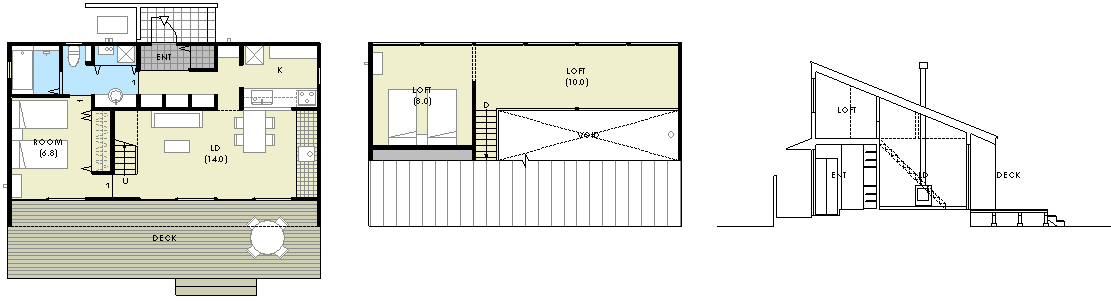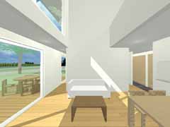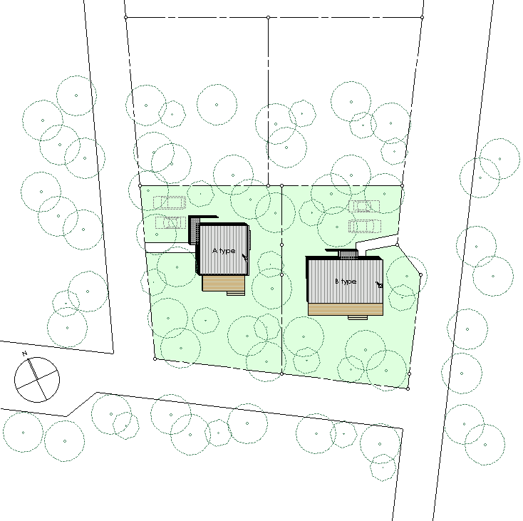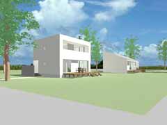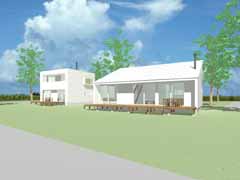| 計画地 :北海道河西郡中札内村 | 森の中、週末住宅向けに開発された宅地内における分譲住宅のモデルプロジェクトである。都会からの交通の便もよい立地であり、手頃に入手可能な、定住も可能なコンパクトな週末住宅というコンセプトで計画されている。一般的な4人家族でも定住できるスペースを持った総2階建てのAタイプと、リタイアした夫婦向けのバリアフリーの平屋のBタイプを用意していて、どちらもアトリエや店舗、余暇の拠点など様々な住人が様々な住まい方を展開できる幅をもった住居としている。 |