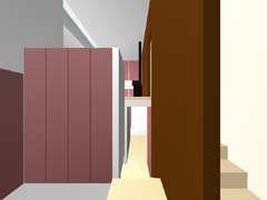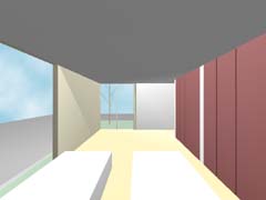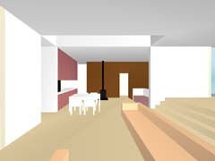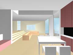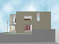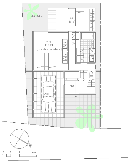 既存樹木の生い茂る前面道路より1.5mほど落ち込んだ敷地。道路レベルの玄関を中心に上下階にスキップフロアの構成。2階リビングは道路側の緑、1階寝室は敷地レベルの緑を囲むように配置されつつ、エントランス及びエントランス上部吹抜によりオープンにつながっている。