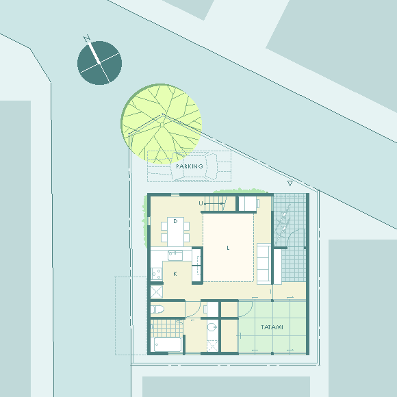 | 計画地 :神奈川県相模原市 | 4m道路が鋭角に交差する角地にある住宅。隣家の迫る南東に4間半×4間半の正方形プランを寄せ、角地部分はドライブスルー可能な駐車スペース兼用の空地として街に開放している。2方向から制限される道路斜線により設定された非対称切妻屋根のもとに収納用の中間階を挟み込んだスキップフロア形式の間取りを組み込んでいる。窓の取りにくい1階の各所には、吹抜けごしに上方からの光が浸透していくような構えとしている。 |