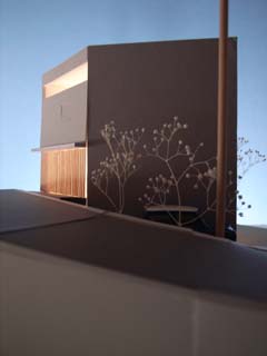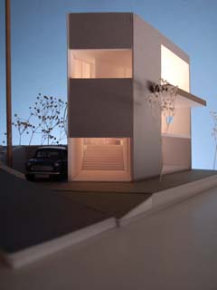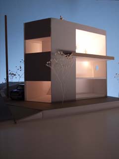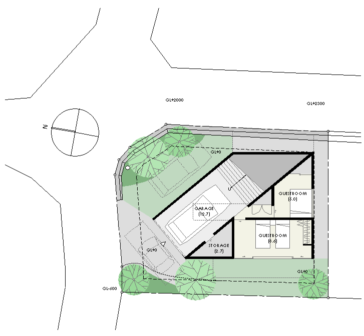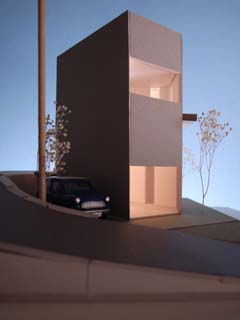 | 計画地 :神奈川県三浦郡葉山町 | 海岸道路からとても急な坂を登った途中に位置する住宅の計画。敷地は角地に面していて接道する2面の道路には約3m程の高低差がある。富士山や江ノ島への素晴らしい眺望を、前面の建物や植栽、電線に風景を妨げられないように建物は3階建てとし3階に居間と趣味のための部屋を設けている。日影規制をクリアするために建物は必然的に5角形の形状となっている。勾配のある道路と敷地との接道位置が限定されるためガレージの位置も自ずと決まってくるが、高低差のある二面の道路をショートカットして貫くような大階段のある吹き抜け空間をビルトインガレージとして利用している。これは厳しい建ぺい率、容積率の制限内において3階建てのボリュームを実現するためにも有効である。 |