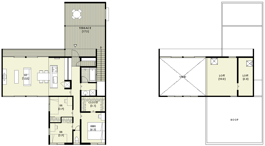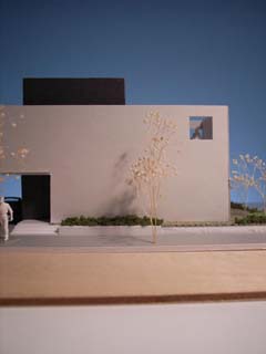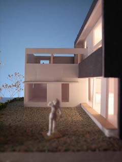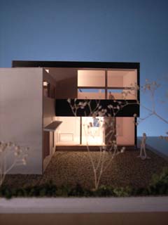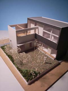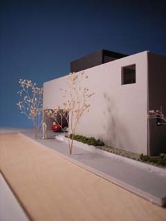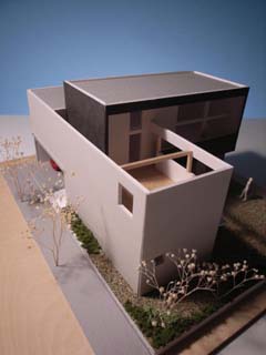 | 計画地 :神奈川県横須賀市 | 歩道もあるバス通りの並木道に面する家。高台にあるため日当たりも見晴らしも良く、北側は小高い山の斜面が近くに迫っている(東方面には花火が見える)。道路は南に向かってゆるやかに下る坂道となっているため、必然的に敷地に進入できる北側を二世帯4台分の駐車スペースとした。道路に面する外観は開口部が少ない長く閉鎖的な壁面としていて、大きく穿った開口部を駐車スペース及び二世帯の玄関への アプローチとしている。各世帯は内部ではつながりを持たない”重層長屋”形式とし、各々のプライベート空間相互には少し距離感を設けている。二階には庭を持たない分、子世帯専用の広いテラスを設け、また二世帯の大家族が集まってバーベキューなどをする庭は敷地の東南部になるべくまとまった広さで確保した。 |