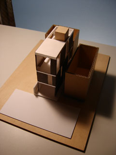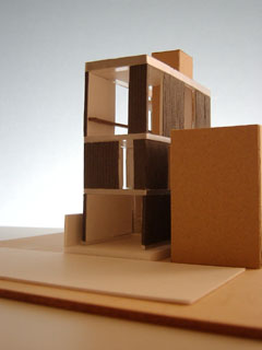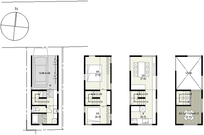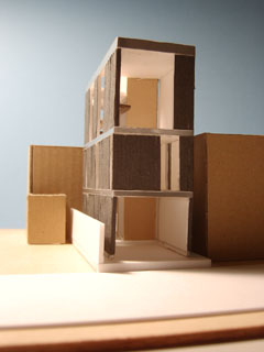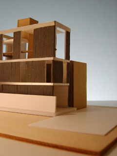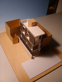 | 計画地 :東京都目黒区 | 幹線道路を一本入ってすぐの住宅地。都心らしくそのほとんどが小規模な宅地で埋め尽くされたような場所であるが、その分とても利便性が高くそのわりに静かで穏やかな環境でもある。敷地面積が13坪しかなく、低層住宅地の敷地条件の中で夫婦(+子供2人)が住めるローコストな家の計画である。南北に長い敷地のほぼ真北が広めの道路であるという好条件のおかげで、北側斜線、日影規制の制限内でなんとか3階建てが可能であることがわかったが、非常に近接している周辺の2階建て建物が今後3階建てに建て替ることは困難であろうと思われる。そのことから、計画建物は四周に視線を開くことができる3階レベルにLDを配置することとし、1階の水廻り、2階の寝室、3階のLDKと上にあがるにしたがってパブリックなスペースとなるように各階を構成している。上方にいくほど天井高さが高くなり、開口部が大きくオープンになっていくことは外観にも明確に反映されるようにしていて、跳ね出しバルコニーなどを設けない箱型の建物とした代わりに最上階には非常に気持ちがよいであろう屋上テラスを設けていて採光にも有効に活用している。 |
