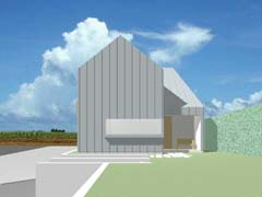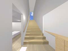 | 計画地 :神奈川県逗子市 | 谷あいの北斜面を造成した敷地。南側はがけと木々が高く敷地に覆いかぶさり日照は期待できないけれども、北と北東側には山を望む眺望が開けている。低くなった北道路の斜線制限と、南のがけの崩壊対策の建築制限によって、建物の配置や高さにはかなりの制約がある場所に、2人と猫一匹のための小さな家が求められた。2階の北向きの眺望を活かすために2階に居間、1階に寝室と水廻りとをシンプルな形状の切妻の内部に配置し、がけに沿う変形敷地部分には、既存の敷地内階段のアプローチからそのままスパイラル状に2階へと導くかたちで、光の演出の施された玄関(階段)ホールを付け加える形とし、明解なプランニングとしている。 |
